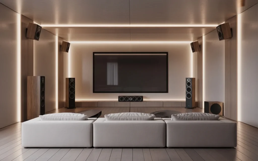 Minimalist home theater design emphasizes clean lines, hidden storage, and a clutter-free aesthetic. Neutral tones, simple furniture, and soft lighting create a calm, modern atmosphere. This is a strong choice for open-plan homes or people who want a theater that blends with the rest of their decor. It is also a trending aesthetic on Pinterest because it feels fresh, airy, and elevated. In a minimalist theater, every item should feel intentional.