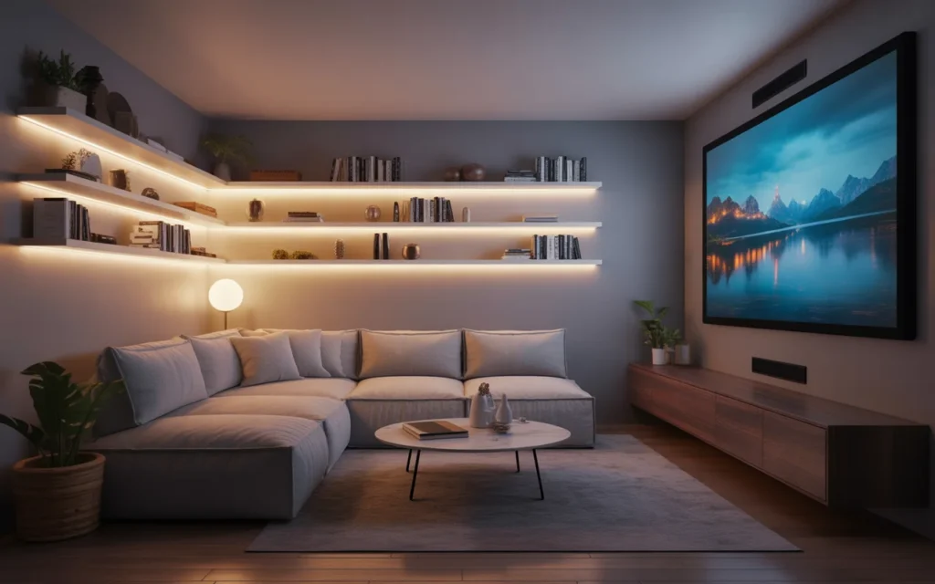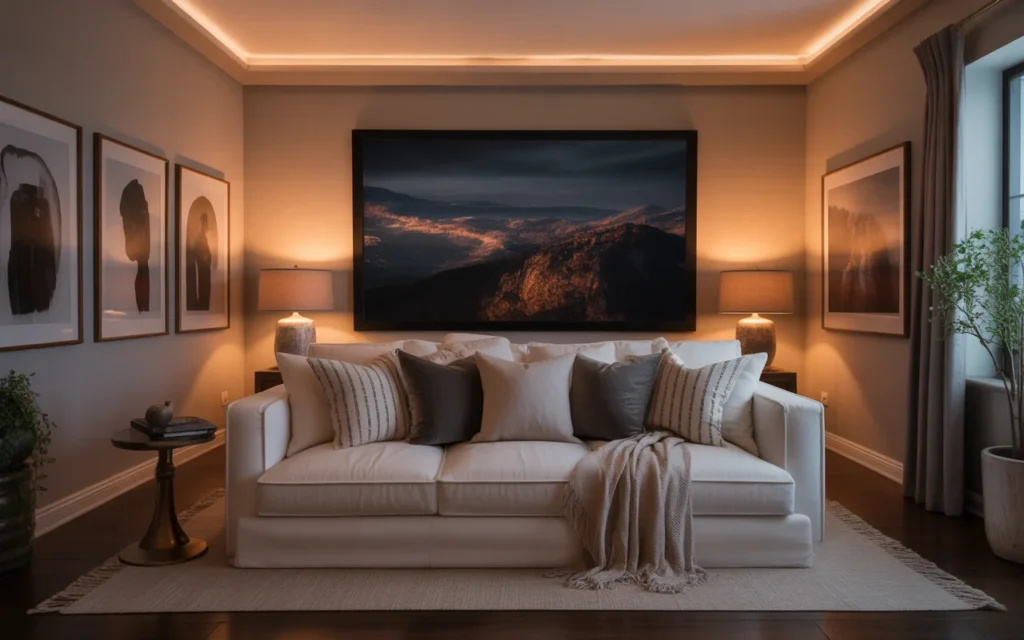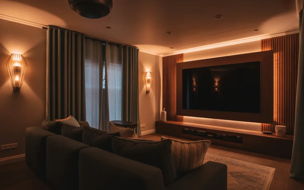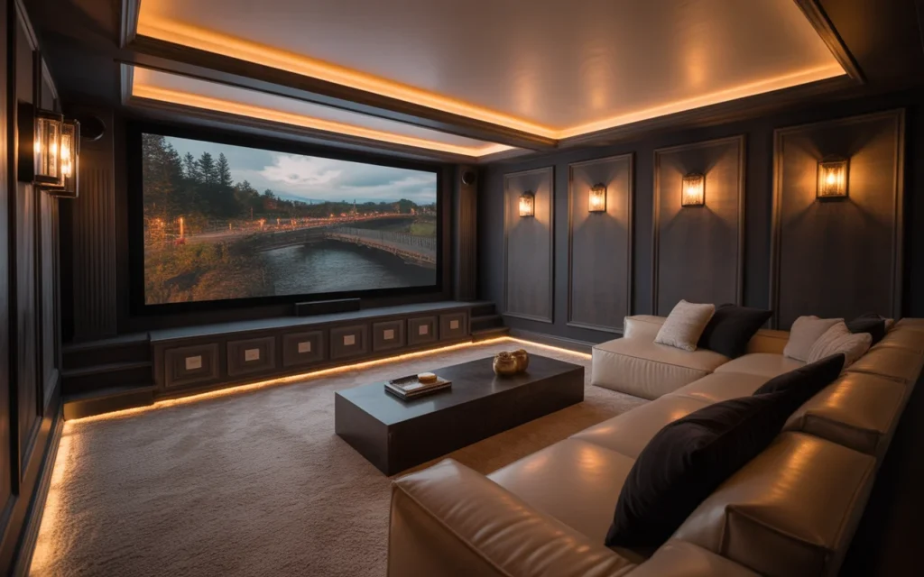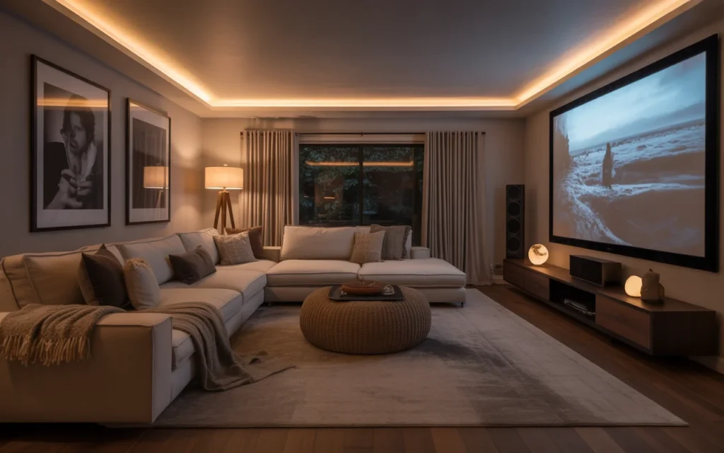 Lighting can make or break a home theater. The best setups use layers: recessed ceiling lights, dimmable sconces, LED strip lighting, and floor-level pathway lights. This creates a mood, improves safety, and gives you flexibility for different activities. Soft lighting is one of the easiest, stylish ideas to copy because it instantly transforms a room. It also photographs beautifully, which is why it is popular in trending aesthetic home decor content. Warm lighting feels inviting and helps the room look finished.