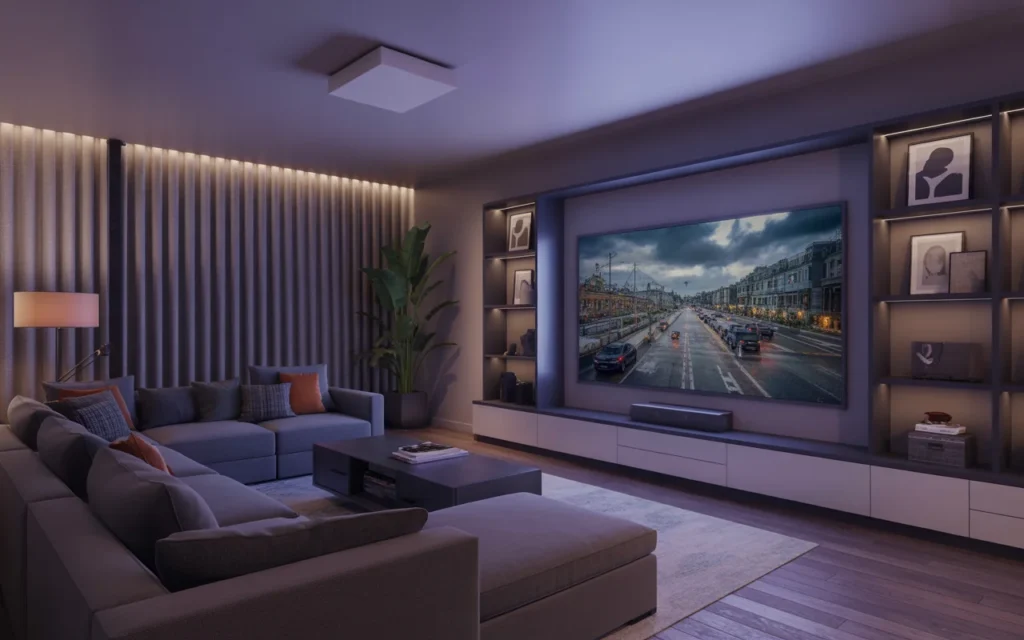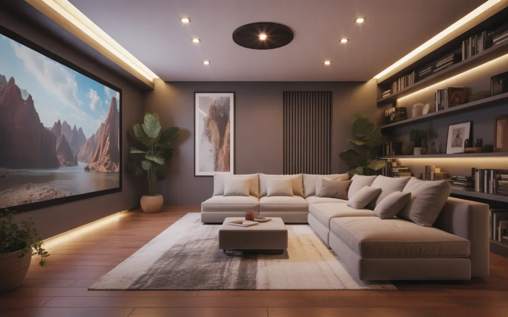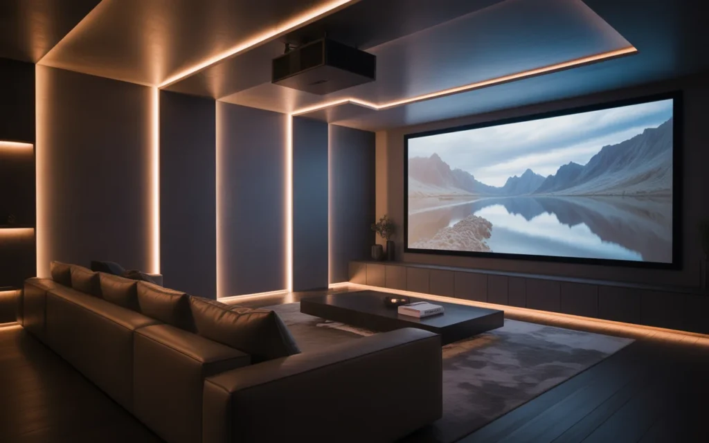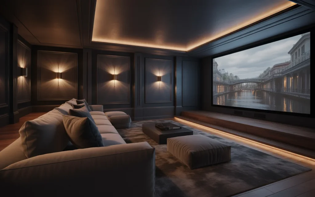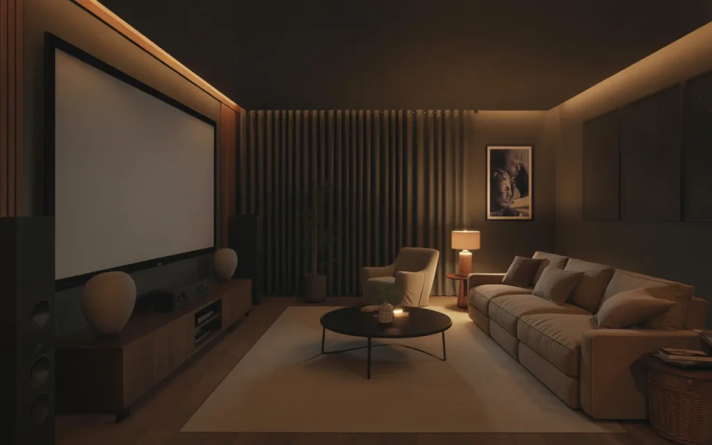 A projector screen can make a home theater feel dramatic and high-end. It works beautifully in rooms where you want a true movie experience. Ceiling-mounted or hidden drop-down screens are especially sleek. Projectors are also great for minimalist designs because the screen can be hidden when not in use. This is one of the most stylish ideas for a modern, uncluttered room. Pair it with dark walls and simple seating for a trending aesthetic that feels clean and elevated.