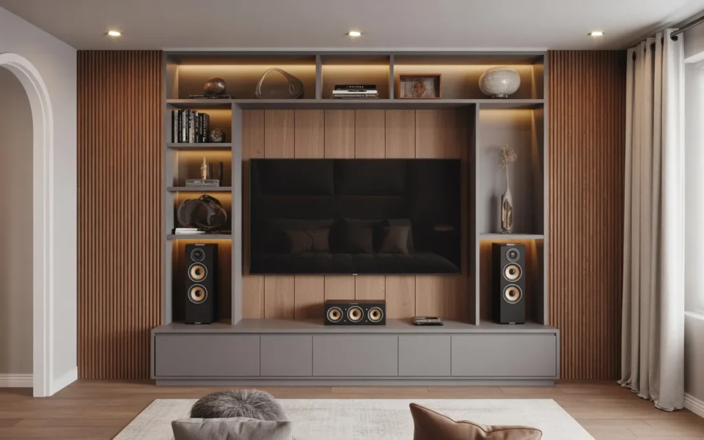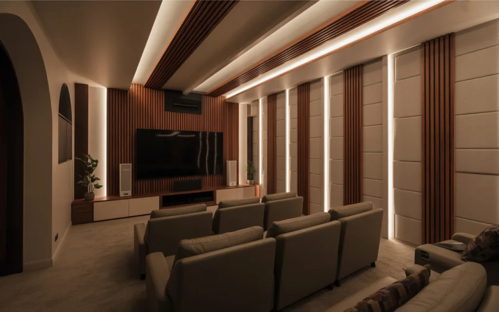 Acoustic panels improve sound quality, but they can also become part of the design. Fabric-covered panels, wood slat panels, or geometric wall treatments can soften noise while adding texture and style. This is a smart idea for anyone who wants better sound without sacrificing the room’s decorative feel. It is also a trending aesthetic detail because it mixes performance with modern design. When done well, acoustic panels look intentional and upscale.