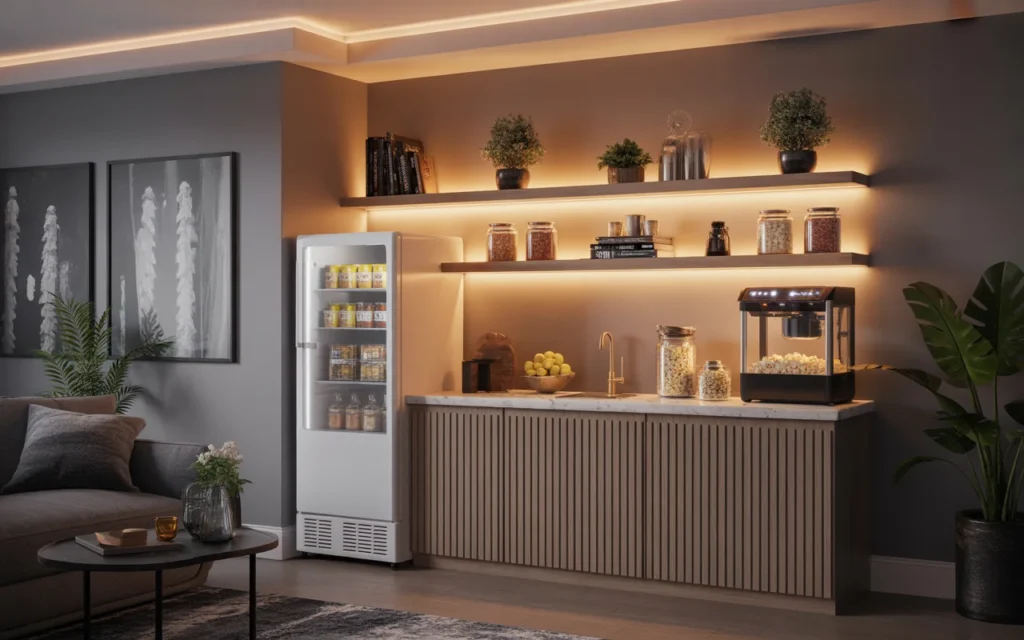 A snack station makes the room feel fun and complete. You do not need a full bar to make it work. A compact cabinet, floating shelves, a mini fridge, and a popcorn machine can create a charming movie-night corner. This is one of the most shareable room ideas because it feels both practical and playful. It also adds personality, especially when paired with vintage signs, glass jars, or soft under-cabinet lighting. It is excellent decor inspiration for family homes and entertaining spaces.