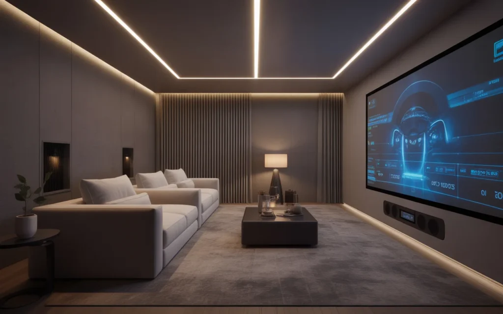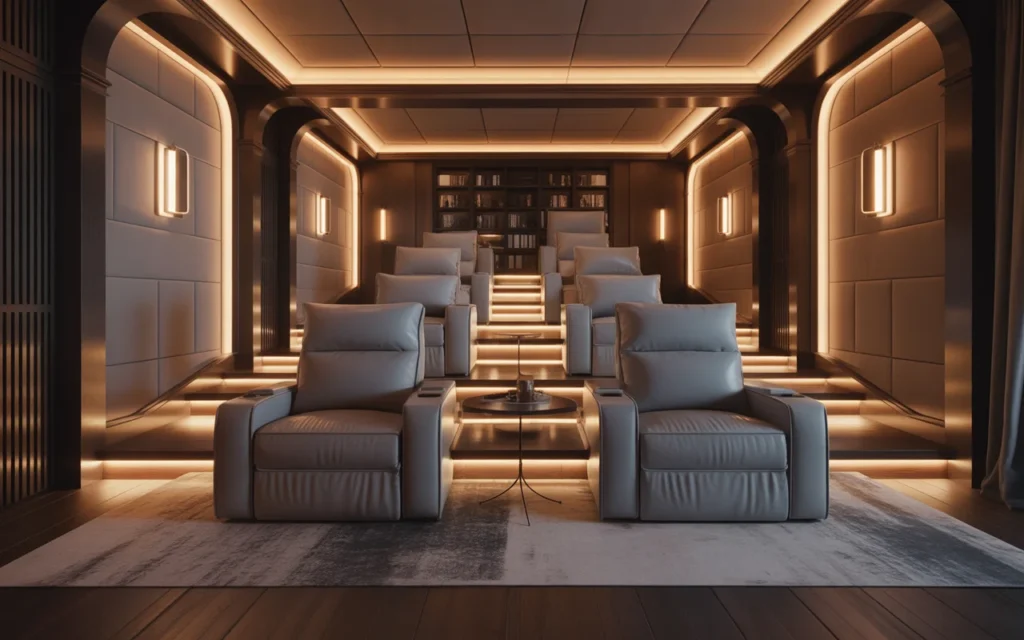 Smart technology makes a home theater easier and more enjoyable to use. Automated blackout shades, voice-controlled lighting, hidden speakers, and one-touch remote systems make the room feel seamless. These upgrades also help keep the design clean by reducing the number of devices that need to be visible. Smart integration is one of the most modern, stylish ideas for a high-functioning space. It supports both comfort and a sleek aesthetic, which is why it is popular in premium room ideas.