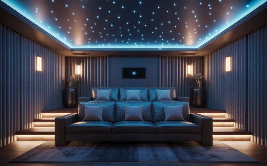 A ceiling detail can turn an ordinary home theater into a memorable space. Fiber optic star ceilings, painted dark ceilings, wood beams, or coffered designs draw the eye upward and make the room feel more complete. This is one of the most dramatic room ideas for a theater because it adds mood without using extra floor space. It is also highly visual, making it great for Pinterest-style decor inspiration. Even a simple painted ceiling can add depth and a more finished look.