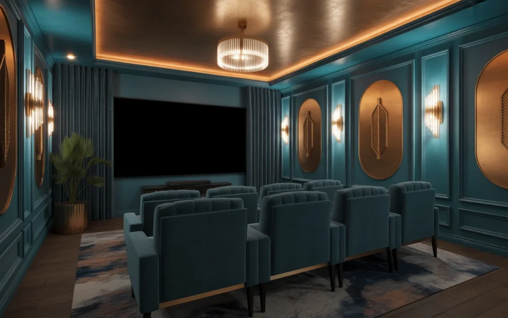 If you want your home theater to feel luxurious, modern glam is a beautiful direction to take. Velvet seating, brass accents, mirrored details, and dramatic lighting can instantly elevate the room. This style works especially well with deep jewel tones like emerald, navy, and plum. It is one of the boldest, stylish ideas for homeowners who love statement decor. The key is balance: rich details without too much clutter. A glam theater can feel both dramatic and inviting.