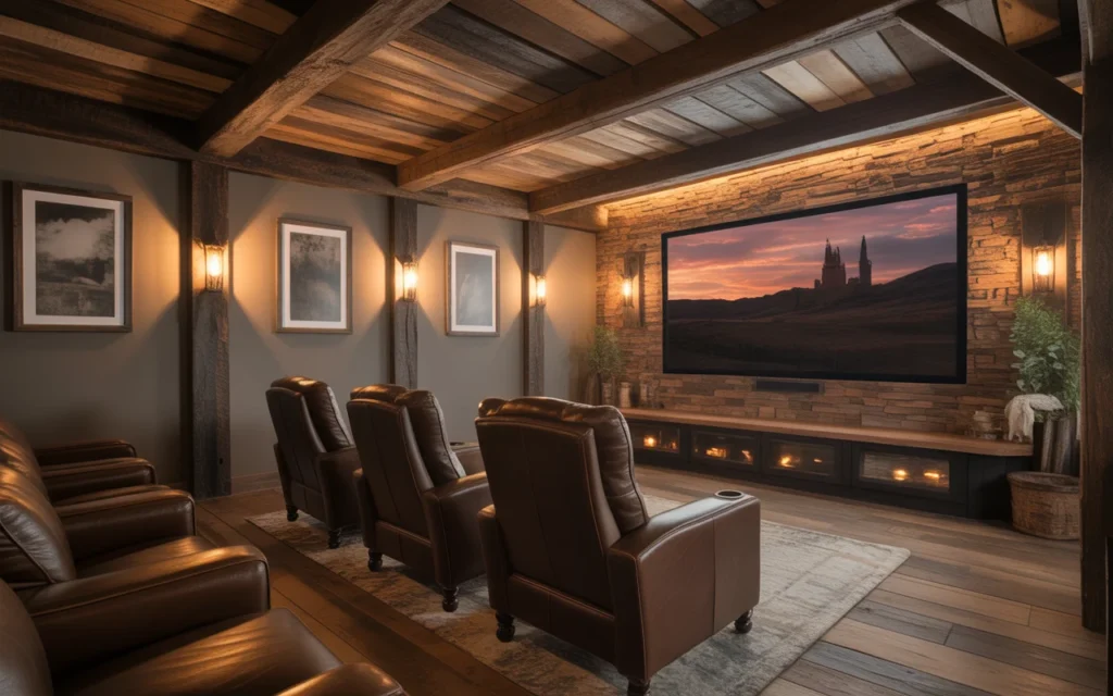 Rustic home theater decor feels relaxed, cozy, and welcoming. Wood beams, stone details, leather seating, and earthy colors create a room that feels grounded and timeless. This idea is perfect for cabins, farmhouse homes, or anyone who prefers warmth over sleek minimalism. It is one of those stylish ideas that makes a theater feel more like a retreat. Add soft lighting and textured fabrics to keep the space comfortable and layered. Rustic decor inspiration stays popular because it feels real and lived-in.