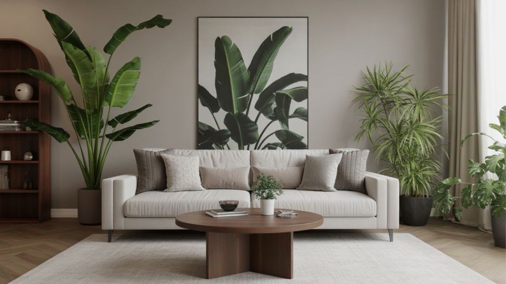 Large statement plants such as fiddle leaf figs, rubber plants, or palms work beautifully in empty corners, adding height and visual interest. Medium-sized plants placed beside sofas, coffee tables, or TV units help balance the space, while smaller tabletop plants bring subtle charm without overwhelming the décor. Mixing floor plants with table and shelf plants creates a layered, dynamic look.