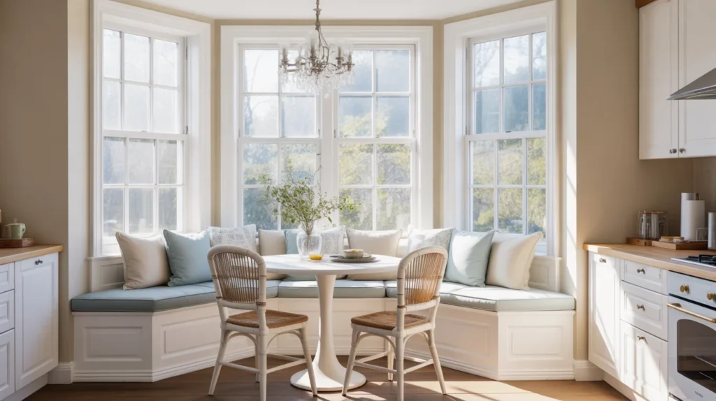 A window-wrapped banquette can do double duty as both dining space and quiet retreat. During meals, it feels bright and inviting, and during slower moments, it becomes the perfect spot for coffee, reading, or laptop work. This is one of the most charming kitchen banquette seating ideas because it adds both lifestyle value and visual beauty. It fits especially well in cottage, transitional, and family-friendly kitchens.