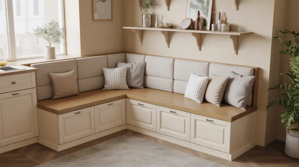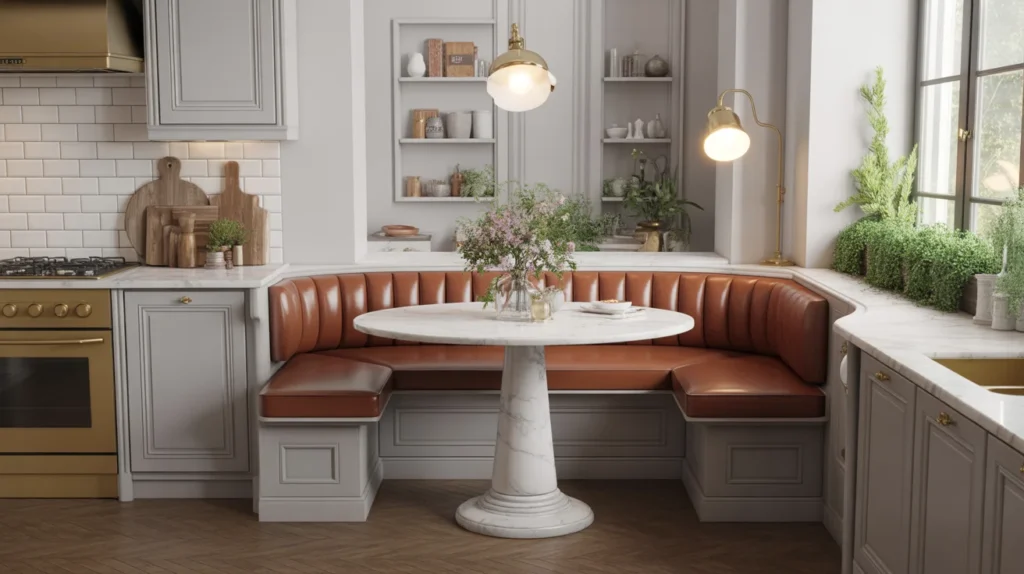 A built-in corner banquette is one of the smartest kitchen banquette seating ideas for smaller homes. It uses underused square footage, instantly making the room feel more intentional. Hidden drawers underneath the bench keep linens, placemats, kidsโ art supplies, or small appliances tucked away. This setup works especially well in compact breakfast nooks because it adds storage without making the space feel crowded. For decor inspiration, pair a painted bench base with soft neutral cushions and a simple round table.