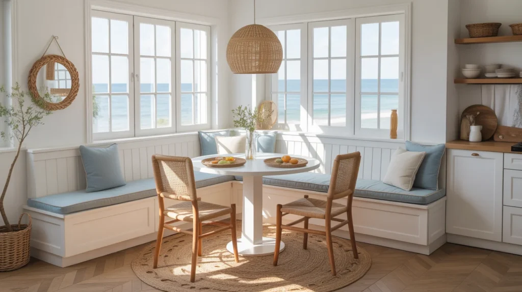 If you love breezy spaces, a coastal banquette can make your kitchen feel fresh and relaxed. White paneling, sandy neutrals, woven textures, and soft blue details create that easy vacation-at-home mood. This works beautifully in bright kitchens and window nooks where natural light can do most of the styling. It is a soft, trending aesthetic that still feels classic.