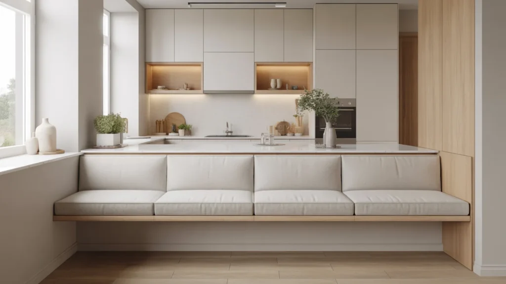 A floating banquette mounts to the wall, leaving the floor visible beneath, which makes the kitchen feel larger and lighter. It is ideal for small modern homes or anyone who prefers a streamlined look. This design fits a minimalist, trending aesthetic and works especially well with flat-front cabinetry and subtle finishes. Even with its sleek shape, it can still feel cozy once you add slim cushions and soft lighting.