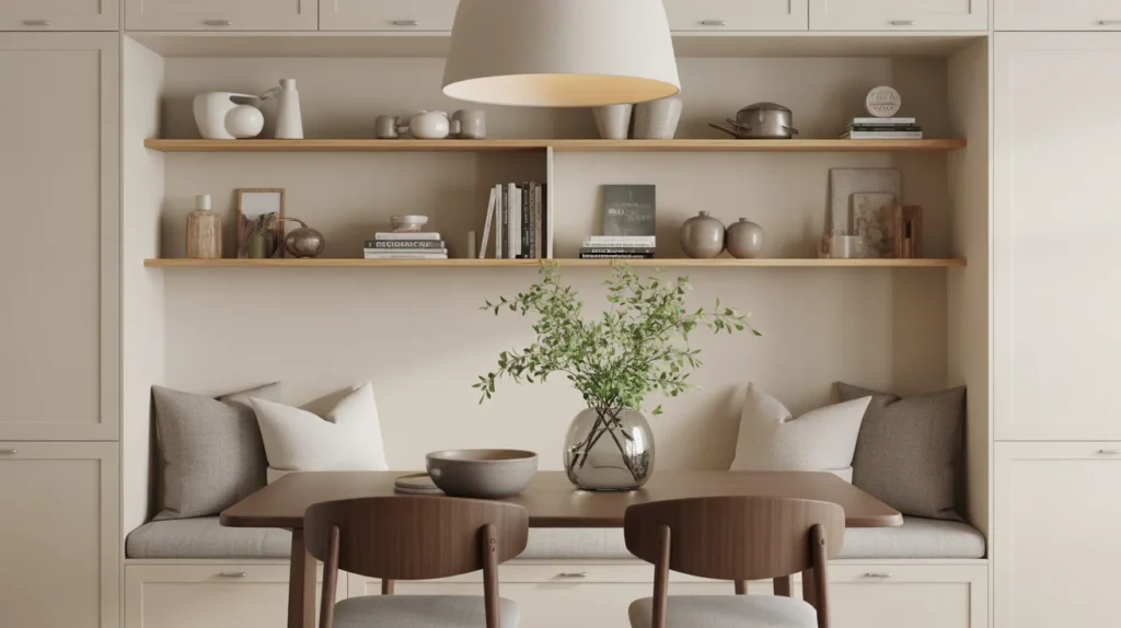 Adding shelving above a banquette turns the nook into a styled feature wall. It gives you space for cookbooks, ceramics, greenery, or framed art while making the area feel more finished. This is one of the most visually appealing kitchen banquette seating ideas because it combines seating with vertical interest. For decor inspiration, style the shelves lightly, so they enhance the nook rather than clutter it.