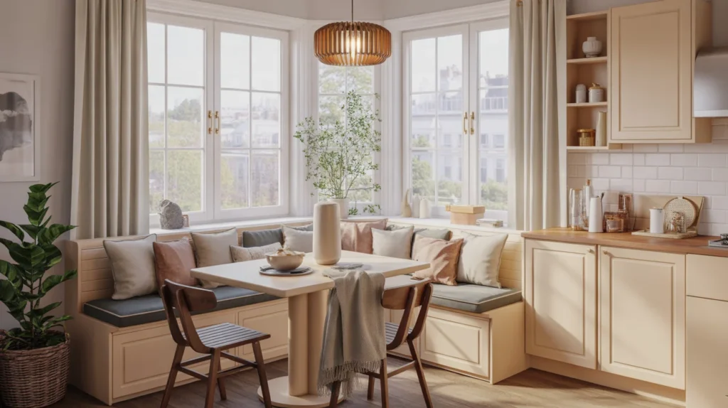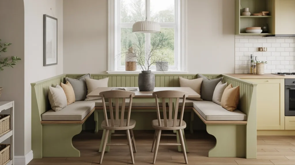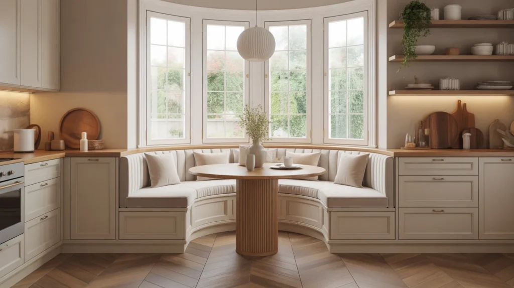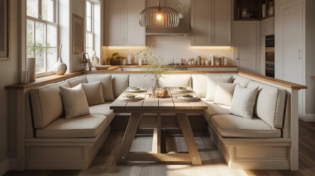 A U-shaped banquette is ideal for bigger households or anyone who loves hosting. It wraps the table in seating, making the nook feel social, snug, and family-friendly. This layout can turn a plain corner into the heart of the kitchen, especially when styled with layered cushions and a warm pendant overhead. It also fits a cozy, trending aesthetic that balances function and comfort. Among all room ideas, this one is especially useful for homes that need to seat several people without using lots of chairs.
