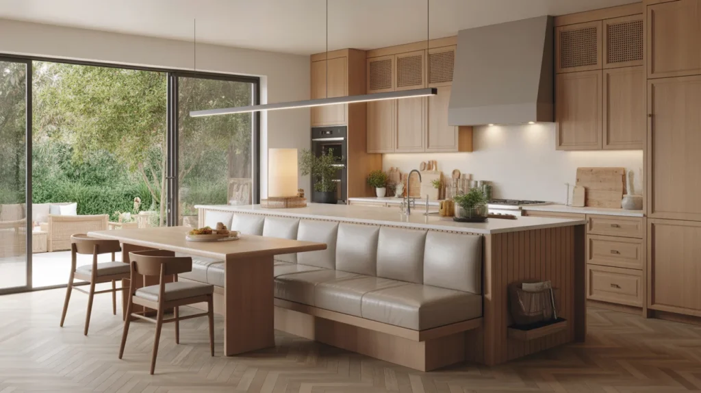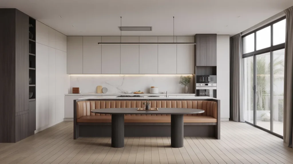 An island-end banquette adds a smart dining spot without needing a separate breakfast room. It feels built-in and works especially well in open kitchens where you want one area to serve many purposes. This design can look sleek and architectural when the island and banquette share the same finish. It is one of the most practical kitchen banquette seating ideas for busy households that want casual seating with a custom edge.