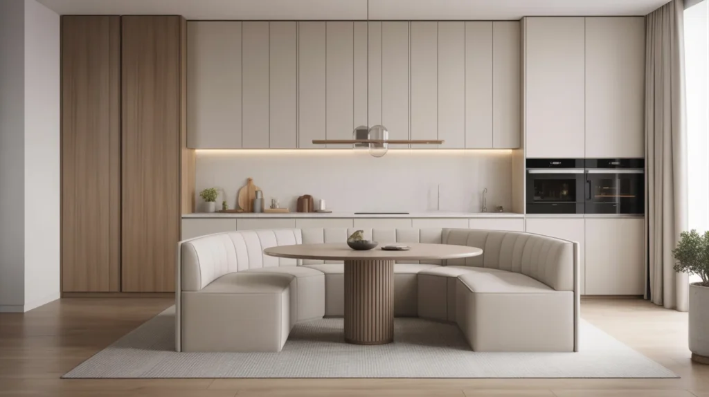 A curved banquette brings softness to a kitchen full of straight lines. It creates a more intimate dining area and makes conversation feel easy and natural. This look feels upscale, especially when paired with an oval or round pedestal table. It is one of the most stylish ideas for anyone wanting a custom designer touch without overloading the room with decor. For a polished, trending aesthetic, choose subtle upholstery, layered lighting, and clean wall details.
