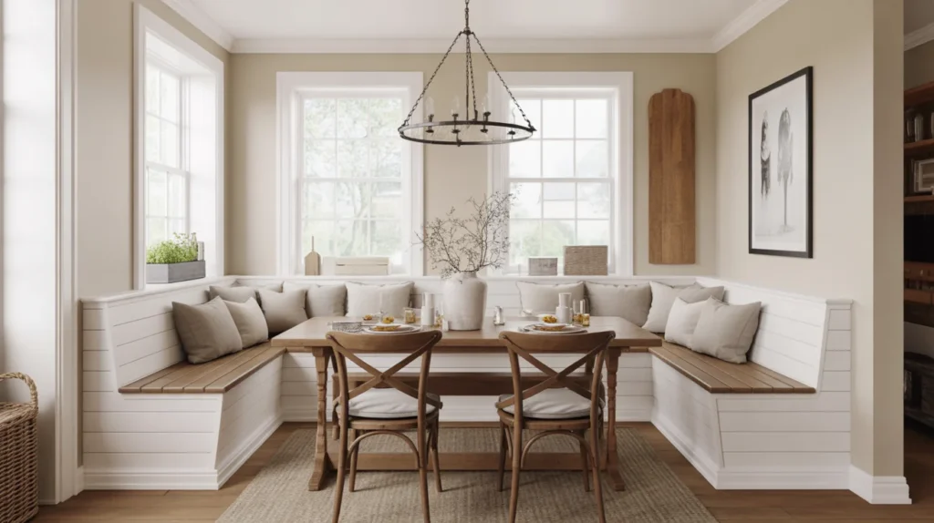 For a cozy look that still feels current, a modern farmhouse banquette is always a favorite. Shiplap detailing on the base or wall adds character, while soft linen cushions keep things relaxed and livable. This style is perfect if you love warm woods, classic lighting, and a welcoming atmosphere. It is one of those stylish ideas that looks charming in both new builds and older homes.