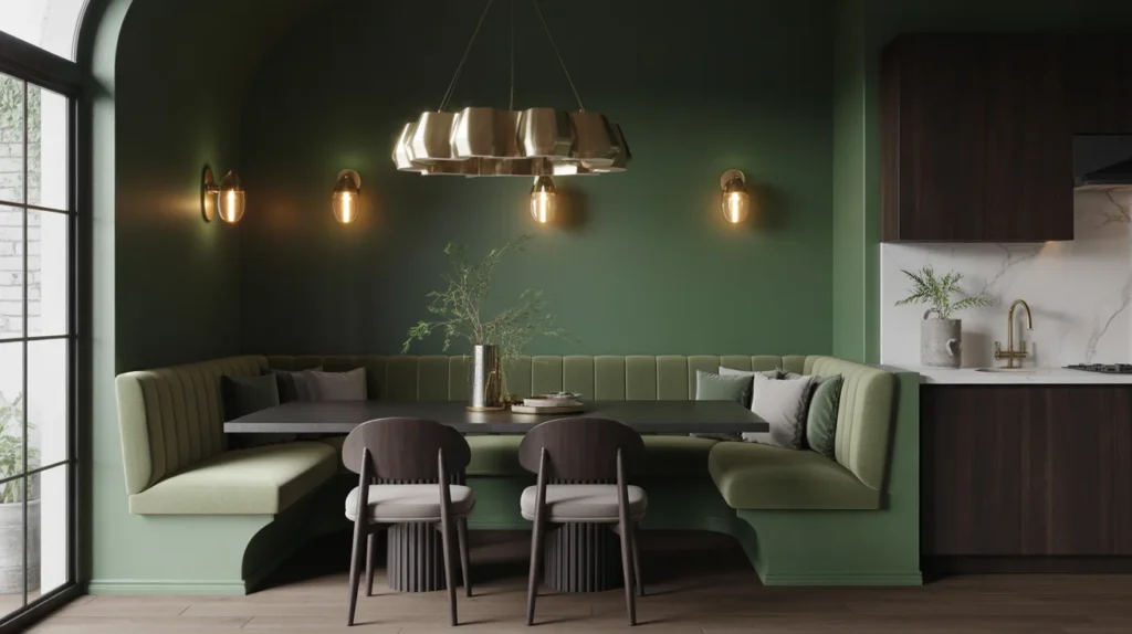 A moody banquette can completely transform a plain kitchen nook. Deep green, charcoal, navy, or rich brown upholstery adds warmth and sophistication while making the seating area feel anchored. This look is especially effective in kitchens with brass hardware, darker wood tones, or dramatic pendant lighting. It is one of the best stylish ideas for homeowners who want more personality and a bold, trending aesthetic.