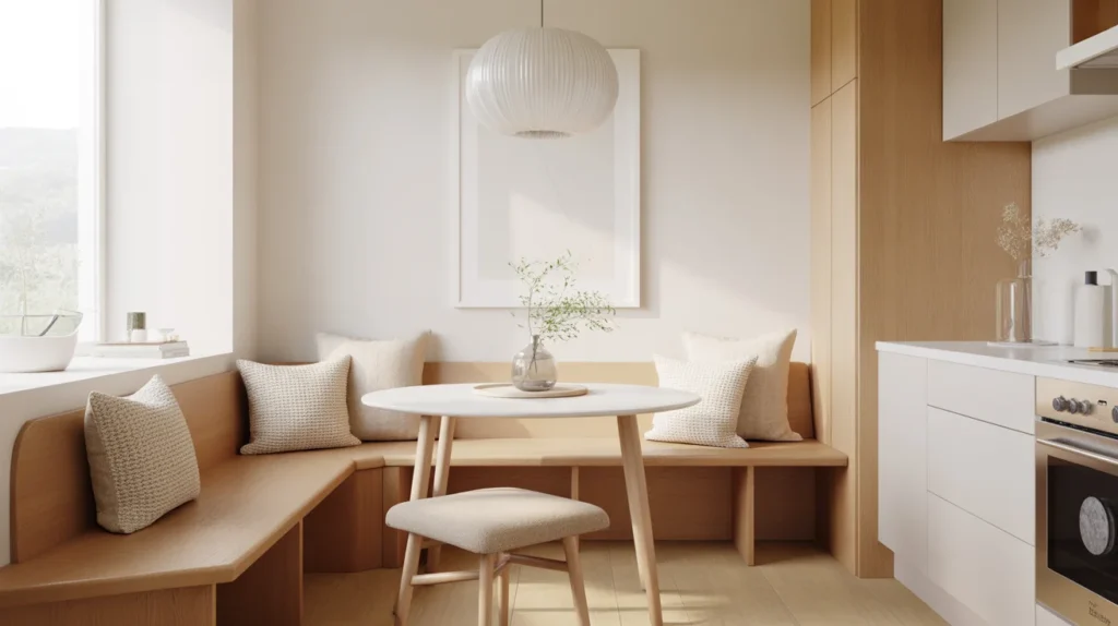 A Scandinavian-inspired banquette feels calm, bright, and effortlessly modern. Think pale oak, soft white walls, minimal lines, and tactile fabrics in cream, oatmeal, or light gray. This is a strong choice if you want kitchen banquette seating ideas that feel timeless rather than overly trendy. The result is simple, clean, and quietly beautiful. For Pinterest-worthy room ideas, add a paper pendant and one branch in a ceramic vase.