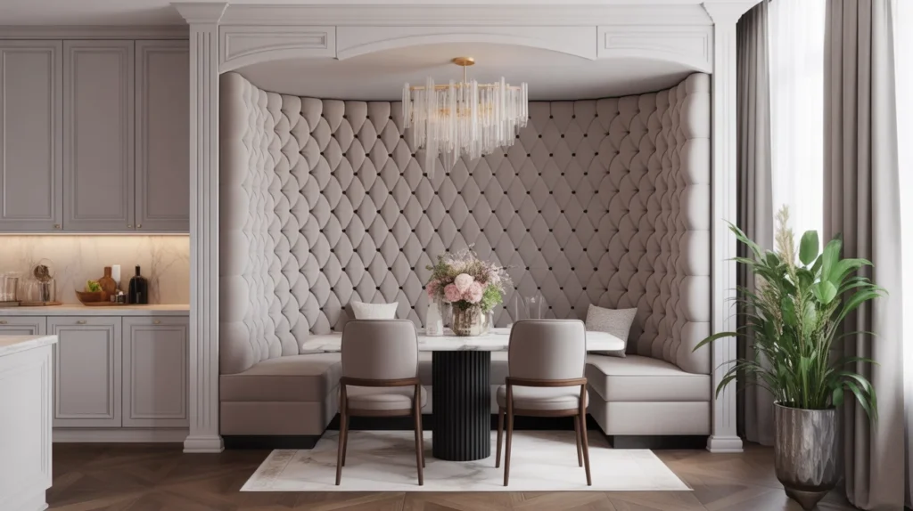 A tufted high-back banquette makes a kitchen nook feel almost like a built-in sofa. It adds softness, comfort, and a slightly formal note that works beautifully in traditional or transitional homes. This is a great option if you want your dining area to feel elevated enough for entertaining while still cozy for daily use. For a luxe trending aesthetic, pair tufting with a simple table and sculptural light fixture.