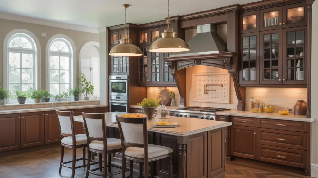 Dark walnut cabinets feature a rich, luxurious wood tone that suits both traditional and modern kitchen styles. The deep, warm color adds sophistication and elegance, creating a timeless, high-end look. Perfect for those seeking a refined, classic feel, dark walnut pairs beautifully with both light and dark elements, offering versatility in design. Whether used in a traditional kitchen with ornate details or a modern space with sleek lines, dark walnut cabinets provide depth and a sense of luxury, elevating the overall ambiance of your kitchen.