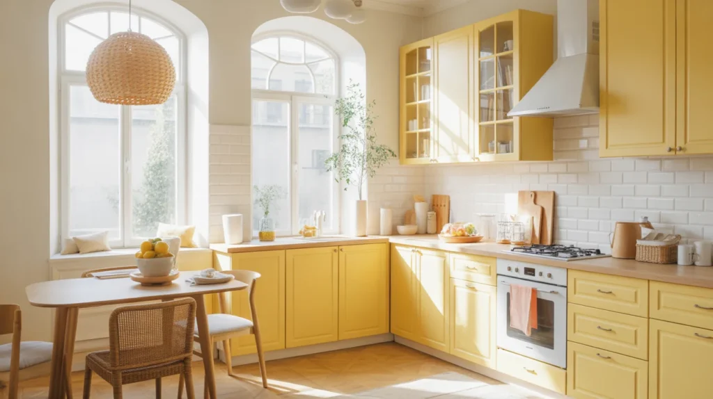 Soft yellow cabinets bring a cheerful color that fills the kitchen with warmth and energy. This light, sunny hue creates a bright and welcoming atmosphere, perfect for enhancing the mood of the space. Soft yellow pairs beautifully with neutral tones like white, gray, or light wood, adding a fresh, optimistic vibe to any kitchen style. Ideal for creating an uplifting, cozy environment, soft yellow cabinets are perfect for homeowners seeking to bring a touch of happiness and vibrancy to their kitchen design.