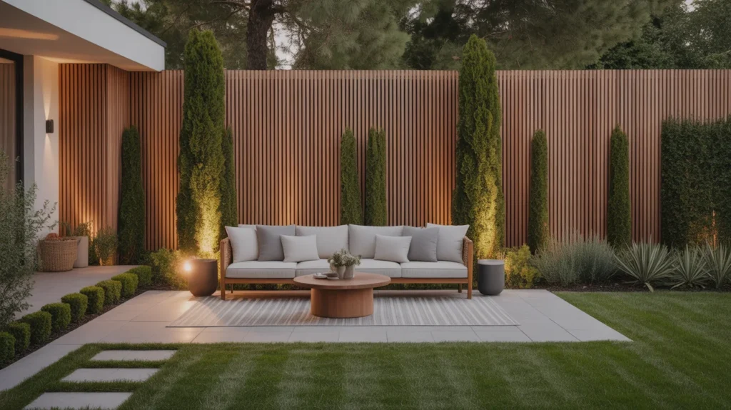 A vertical wooden slat privacy wall is an ideal choice for those seeking privacy without sacrificing airflow or natural light. The slats are spaced to offer a balance between seclusion and openness, allowing for ventilation while blocking unwanted views. This design not only enhances privacy but also adds a modern, stylish touch to your outdoor space. The natural wood finish can complement various outdoor aesthetics, from rustic to contemporary. With the added benefits of durability and minimal maintenance, a wooden slat privacy wall is both a functional and visually appealing solution for any backyard.
