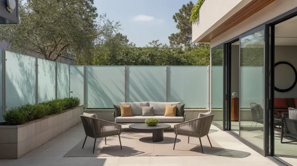 A glass panel privacy wall offers a modern and stylish way to create partial privacy while maintaining an open, airy feel. Frosted or textured glass panels allow for seclusion without sacrificing natural light. The frosted finish ensures privacy by obscuring direct views while still allowing visibility through the textured surface. This design is perfect for creating a sophisticated, sleek look in contemporary outdoor spaces. Glass panels are durable, low-maintenance, and easy to clean, making them a practical yet stylish solution for those who want to blend privacy with elegance in their backyard or garden area.