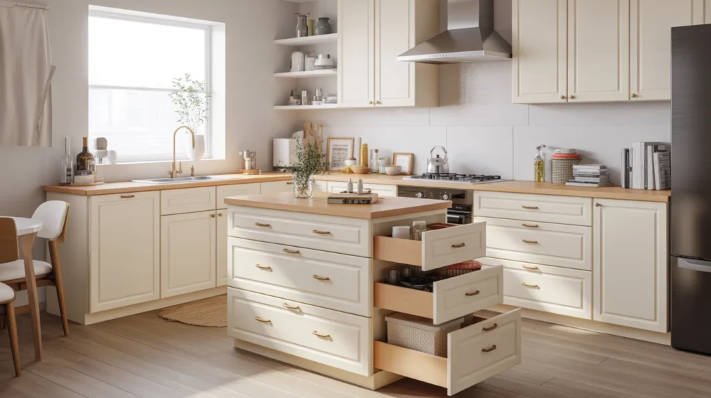 When space is limited, hidden storage matters. A small island with deep drawers can hold cookware, utensils, linens, and pantry items, keeping the kitchen calm and organized. This makes it one of the most functional small kitchen island ideas for busy households. From the outside, the island can still look sleek and simple. That balance between beauty and storage is exactly what makes it so Pinterest-friendly. It delivers both decor inspiration and practical value, especially in kitchens where every cabinet counts.