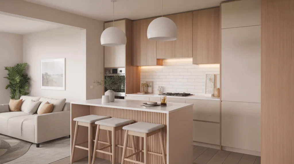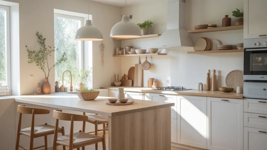 A Scandinavian-style island is perfect for creating a bright, simple, calming kitchen. Light wood tones, clean lines, and minimal styling help a small space feel larger and more peaceful. Among small kitchen island ideas, this one is a favorite for anyone who loves a soft, trending aesthetic. The beauty of this style is in its restraint. A light-wood island can blend into the room while still offering warmth and function. It pairs well with white walls, subtle textures, and organic decor inspiration such as ceramics, linen, and greenery.