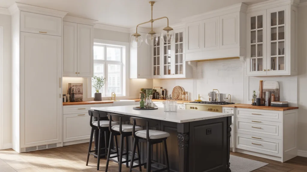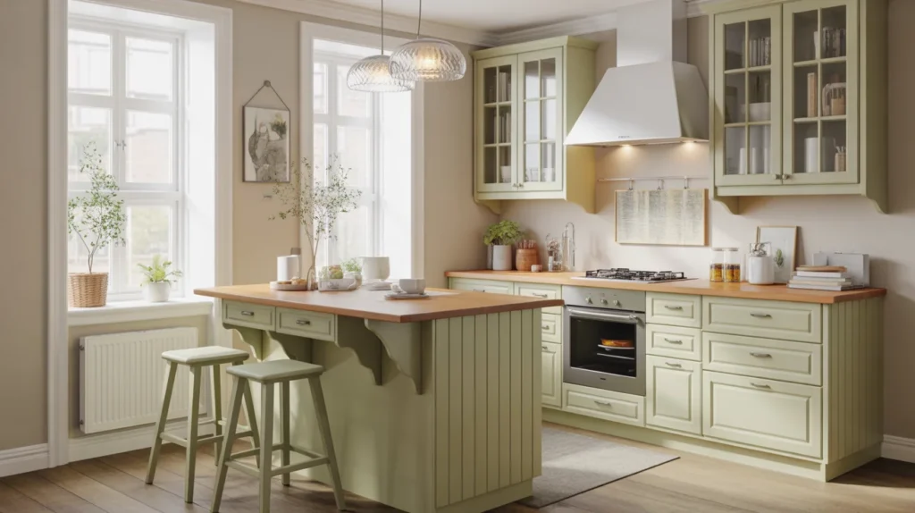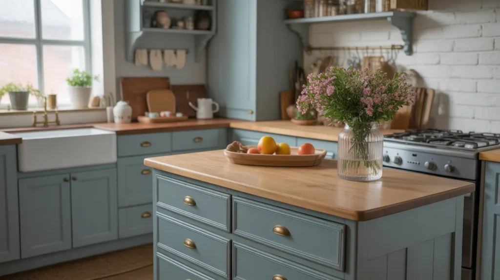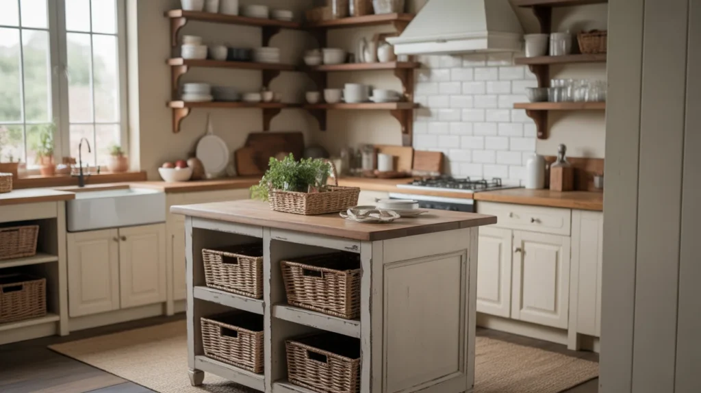 A farmhouse mini island adds warmth, charm, and a lived-in look to a small kitchen. Think turned legs, a wood top, beadboard details, or soft-painted finishes. This approach is perfect if you want small kitchen island ideas that feel cozy and timeless rather than sleek and formal. It pairs beautifully with open shelving, apron sinks, vintage-inspired lighting, and natural textures. For room ideas with a welcoming mood, farmhouse style offers plenty of decor inspiration without needing a large footprint. The key is keeping the island compact and the styling simple.