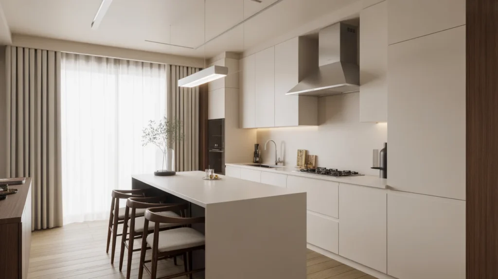 A tiny island with seating overhang can turn a compact kitchen into a more social space. Even a room for two stools can make a big difference for casual meals, coffee breaks, or chatting while dinner is cooking. It is one of those small kitchen island ideas that feels both useful and inviting. This style works especially well in open-plan homes or studio apartments. It adds function without needing a full dining table, and it creates a stylish focal point at the center of the room. For Pinterest-friendly room ideas, pair it with pendant lighting and simple stools.