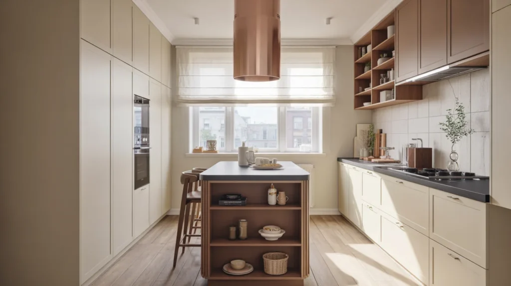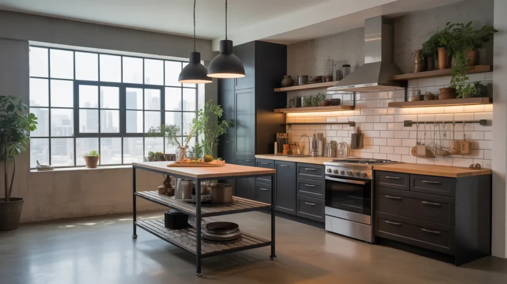 An industrial island combines wood and metal for a cool, urban look that still feels practical in a small kitchen. The open frame helps the space look lighter, while the darker materials bring contrast and edge. This is a strong choice for modern loft-style room ideas or minimalist interiors with character. Use black metal legs, warm wood shelving, and simple bar stools to keep the look balanced. It is one of those stylish ideas that feels intentional without being too decorative. The mix of raw and refined materials also creates eye-catching decor inspiration for social posts.
