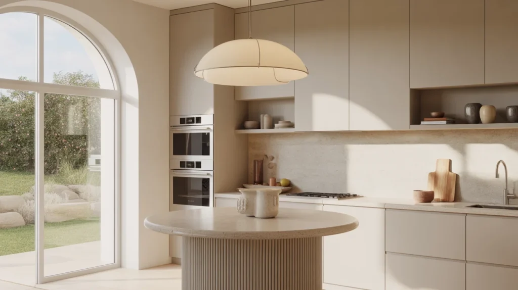 A round or oval island can be a brilliant solution when sharp corners make a kitchen feel cramped. The softer shape improves flow and adds a gentle, custom feel to the room. This is one of the most creative small kitchen island ideas for awkward layouts or family homes with lots of movement. The curved silhouette also adds a stylish, designer touch that sets it apart from standard square islands. It feels fresh, elegant, and a little unexpected, which is why it works so well in decor inspiration content. Pair it with smooth stools and soft finishes for a welcoming look.