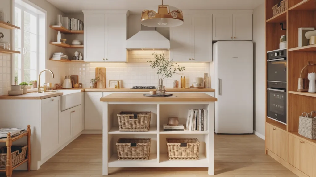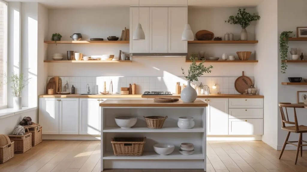 An open-shelf island keeps a small kitchen from feeling heavy. Instead of solid cabinetry, the shelves create a lighter visual look while still offering useful storage for baskets, dishes, or cookbooks. This makes it one of the best small kitchen island ideas for spaces that need function without bulk. The open design also lets you style the shelves beautifully. Stack neutral bowls, add woven textures, or display a few favorite pieces for subtle decor inspiration. This works especially well in bright kitchens with a clean, curated, trending aesthetic.