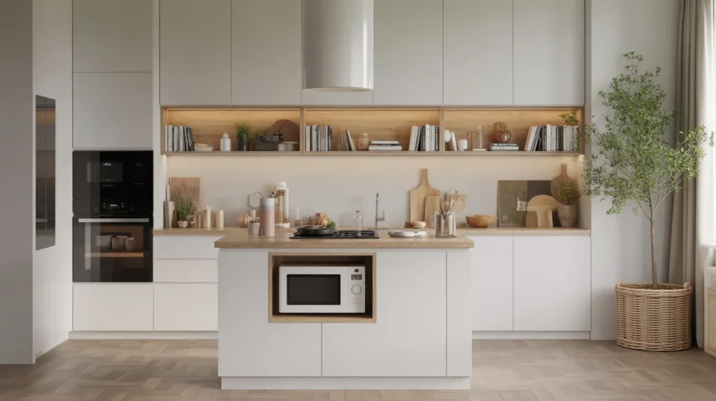 A compact island can also help free up your counters by housing a microwave or small appliance niche. This keeps bulky items off the main worktops and gives your kitchen a cleaner, more open feel. It is one of the smartest small kitchen island ideas for maximizing functionality. This setup is especially useful in modern homes where countertop clutter can quickly make a room feel smaller. By tucking an appliance into the island, you improve both storage and style. It is practical decor inspiration that supports a tidy, streamlined, trending aesthetic.