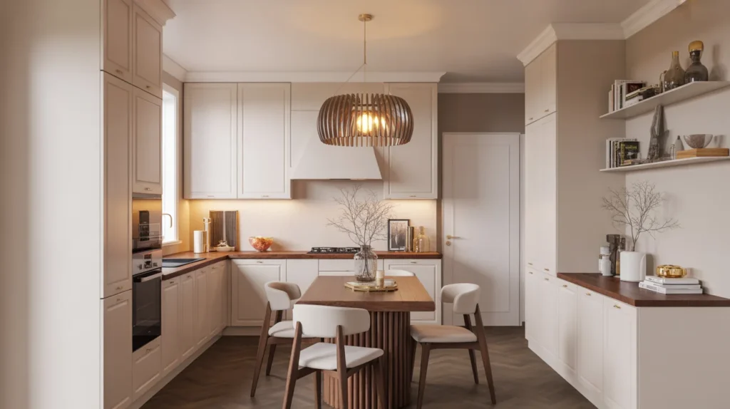 Sometimes the island itself can stay simple while the lighting does the visual work. A small island paired with a bold pendant or mini chandelier creates a strong focal point and gives the whole kitchen a more curated feel. This is one of the easiest, most stylish ways to elevate a compact layout. Statement lighting adds polish, defines the island zone, and makes small kitchens feel thoughtfully designed. It is also a great strategy for decor inspiration photos because lighting instantly creates mood and dimension. Keep the island clean and let the fixture shine.