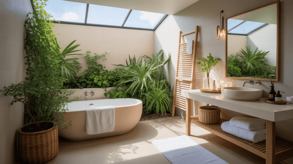 Natural materials and textures play a key role in creating an authentic spa bathroom atmosphere. Elements like wood, stone, bamboo, and linen bring warmth and an organic feel that helps the space feel grounded and relaxing. These materials connect the bathroom to nature, which is essential for a calming spa-like experience.