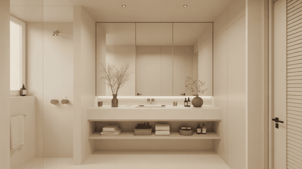 A clutter-free bathroom is essential for achieving a true spa-like atmosphere. Minimalist storage helps keep everyday items out of sight, allowing the space to feel calm, clean, and organized. When surfaces are clear, the bathroom becomes more relaxing and visually balanced.