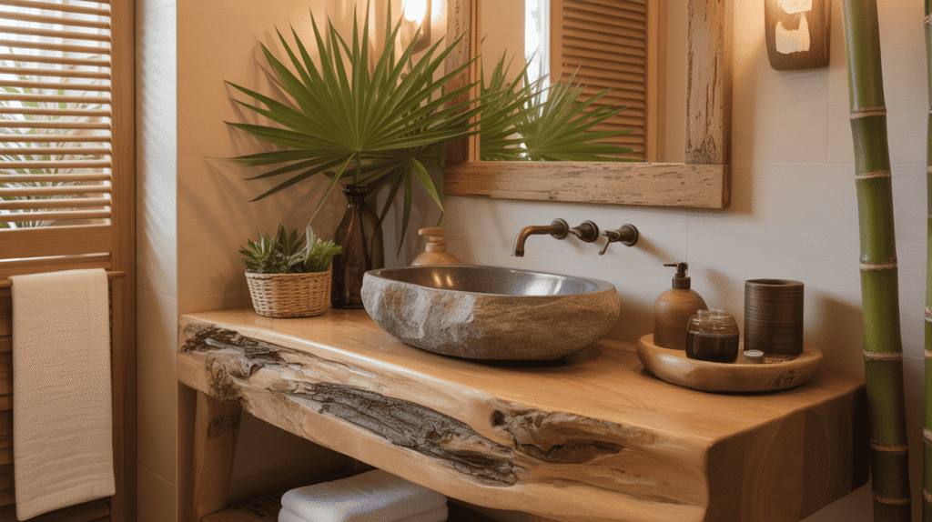 Using a wooden vanity, stone countertops, or textured tiles adds depth without clutter. Soft textiles such as linen towels or woven baskets enhance comfort while maintaining a clean look. Together, natural materials and textures create a balanced, soothing environment that feels both luxurious and inviting.