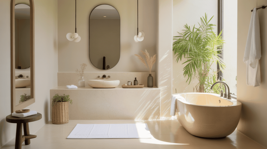 Choosing accessories in neutral tones or natural materials keeps the design cohesive and calming. Small touches such as rolled towels, glass containers, or a cozy robe create a hotel-like spa atmosphere at home. These finishing elements bring warmth, elegance, and a sense of indulgence to the bathroom.