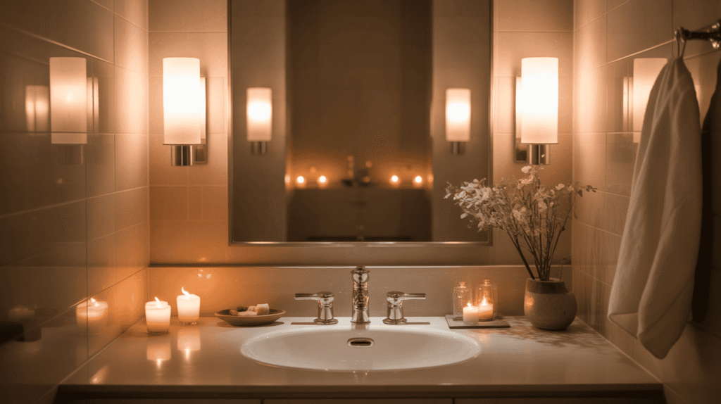 Wall sconces, dimmable lights, and warm LED fixtures work well to create a gentle glow. Candle-style lighting or hidden light strips add a touch of luxury without overpowering the design. Soft lighting enhances textures, highlights décor, and transforms the bathroom into a soothing retreat.