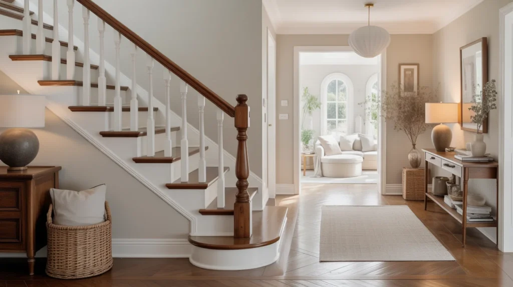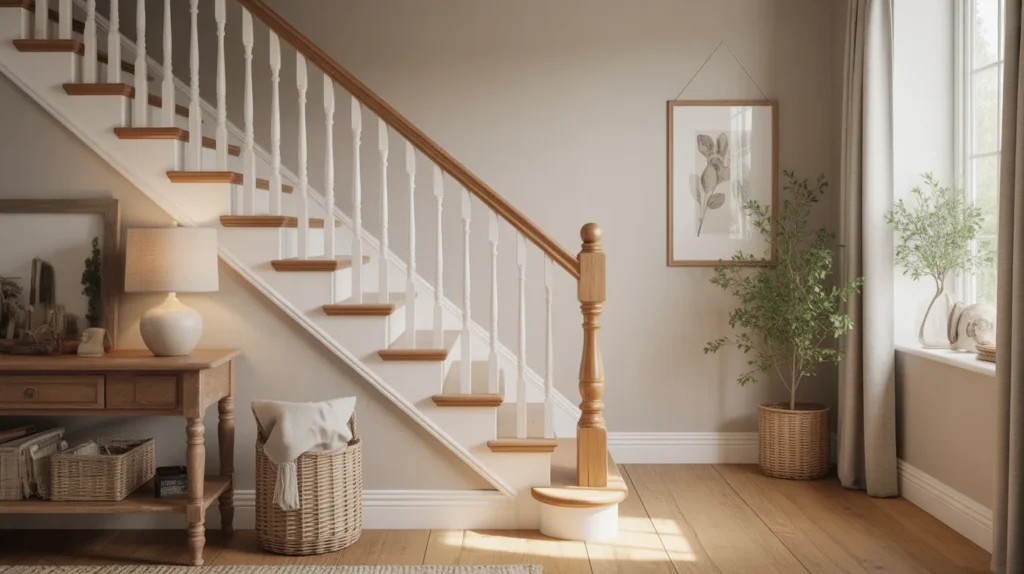 Farmhouse spindle stairs bring warmth, charm, and a sense of tradition. White spindles paired with wooden handrails create a cozy look that feels fresh without losing character. This style is ideal for homes that want a welcoming, lived-in feel while still looking styled for Pinterest. It blends beautifully with neutral palettes, vintage accents, and layered textures. For anyone collecting room ideas with a soft rustic touch, this option is both practical and beautiful.
