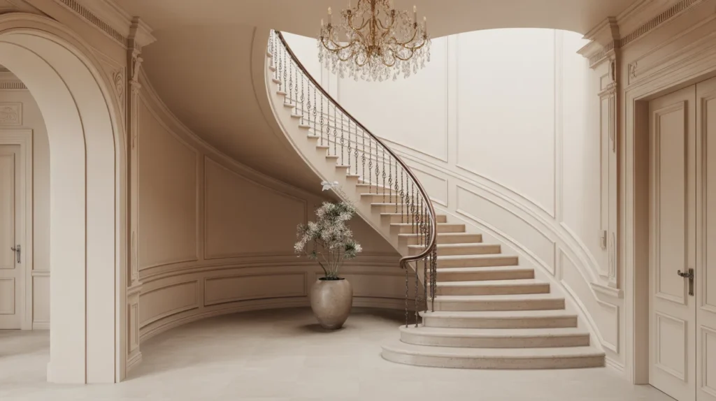 A curved staircase feels elegant, dramatic, and luxurious. Its graceful shape adds movement and softness that straight staircases often lack. This design works beautifully in entryways where you want an unforgettable first impression. It is one of those staircase ideas that instantly elevates a home’s visual appeal. For Pinterest decor inspiration, curved forms are always eye-catching because they feel both classic and high-end. Even simple finishes can look stunning when paired with a curved structure.