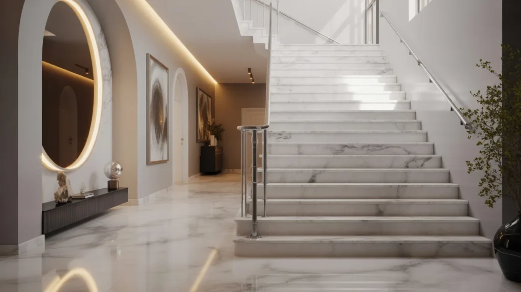 Stone and marble staircases feel luxurious and durable. They instantly bring a refined, upscale look, especially in entryways or larger homes. Lighter stone finishes can brighten the area, while dramatic veining creates visual impact. This is one of the most premium staircase ideas for homeowners wanting a lasting material with strong decorative appeal. It is a favorite for decor inspiration boards focused on elegance, modern classic interiors, and hotel-inspired styling.