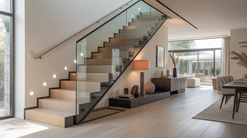 Glass balustrades make any staircase feel sleek and spacious. Because they allow light to pass through, they are ideal for smaller homes or darker hallways. This look is often used in modern and luxury interiors, but it can also pair beautifully with warm wood for a softer finish. For decor inspiration focused on open, bright interiors, this is one of the most timeless staircase ideas. The result feels fresh, clean, and quietly impressive.