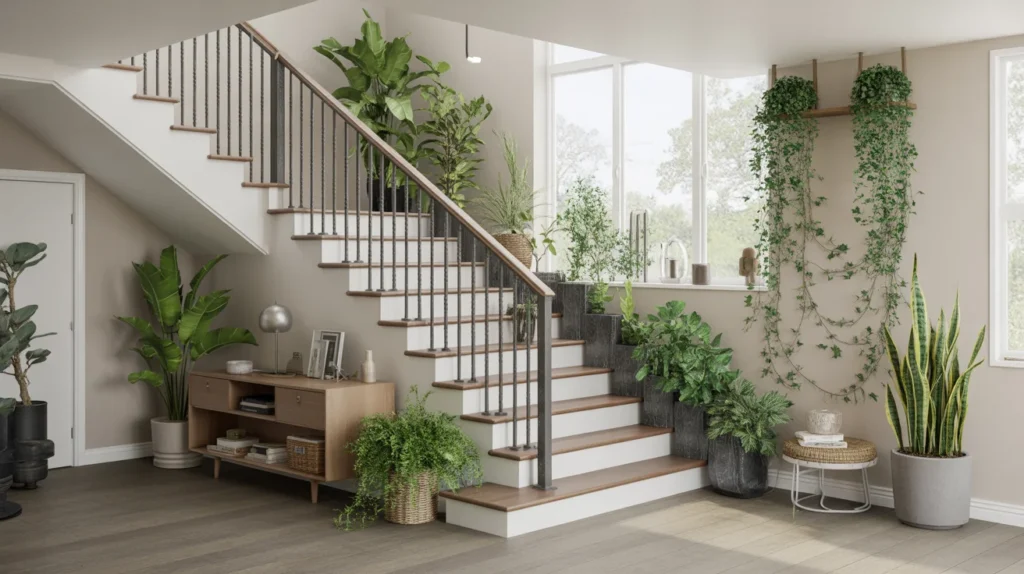 Adding plants around a staircase brings life, softness, and fresh color. You can place potted plants at the base, line a landing with greenery, or hang trailing plants along the wall. This is one of the easiest staircase ideas for creating a more organic and welcoming space. It suits many styles, from boho to modern, and works beautifully in decor inspired by calm, nature-inspired interiors. Plants also help soften sharp architectural lines and make the area feel more lived-in.