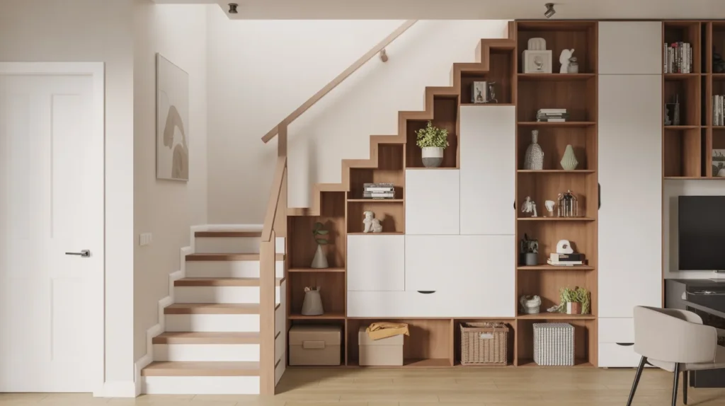 Storage stairs are perfect for homes where every inch matters. Drawers, cubbies, or closed cabinets beneath or within the staircase can reduce clutter while keeping the area visually neat. This is one of the smartest staircase ideas for small homes, apartments, or busy family spaces. It combines function with a polished look, which is why it works so well for practical decor inspiration. When designed well, storage stairs feel intentional rather than purely utilitarian.