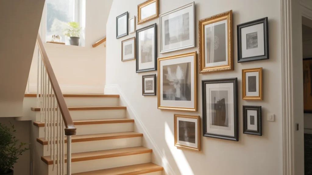 A staircase gallery wall brings storytelling into your home. It can display family photos, art prints, black-and-white sketches, or even travel memories. Because the stair wall naturally draws the eye upward, it is the perfect place to build a visually interesting arrangement. This idea gives endless decor inspiration and works across many styles, from modern to vintage. It is also one of the easiest and most stylish ways to personalize without major construction.