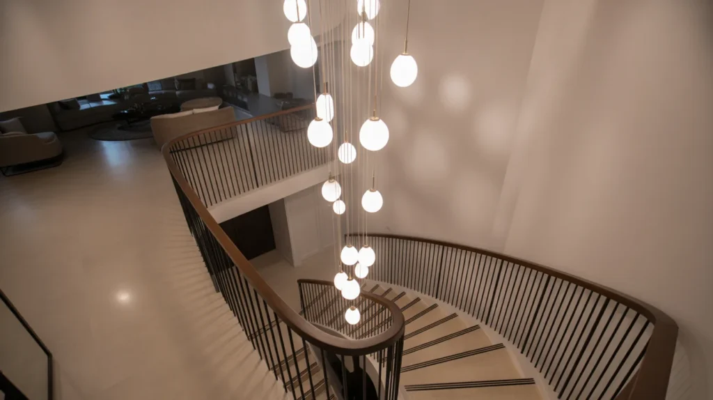 Lighting can completely transform a staircase. A pendant, chandelier, or cluster of hanging lights adds drama while drawing attention to the vertical space. It is one of the most effective and stylish ways to elevate an ordinary staircase without altering its structure. Good lighting also improves mood, depth, and evening ambiance. For a trending aesthetic, sculptural lighting paired with simple stairs creates a perfect balance of form and function.