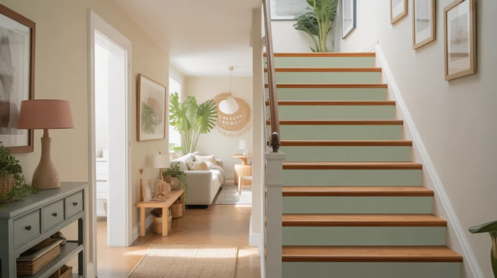 Painted risers are a simple way to add personality to basic stairs. You can use a single color for a clean finish or add subtle patterns for a playful yet polished effect. This option is perfect for homeowners looking for budget-friendly room ideas that still feel custom. It also works well in family homes, cottage interiors, and colorful spaces where character matters. Soft sage, navy, charcoal, and dusty blue are especially popular for a trending aesthetic that feels current but timeless.