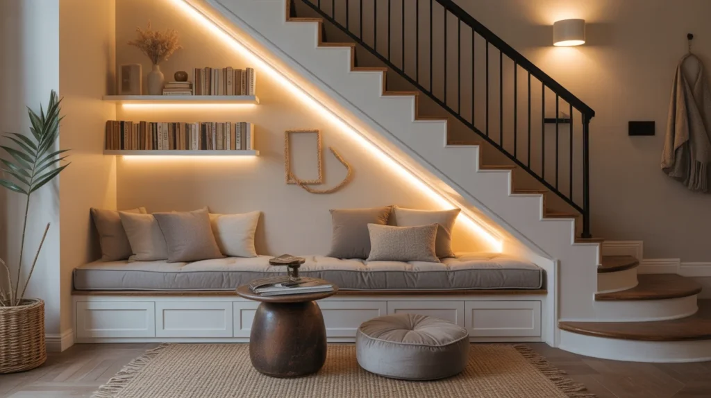 Turning the space beneath the stairs into a reading nook adds both charm and function. Instead of leaving that area empty, you can create a cozy seat, built-in shelves, and soft lighting for a warm retreat. This is one of the best room ideas for homes that need more usable space without adding clutter. It also photographs beautifully for Pinterest because it feels thoughtful, personal, and inviting. A nook like this works especially well in family homes and cottage-style interiors.